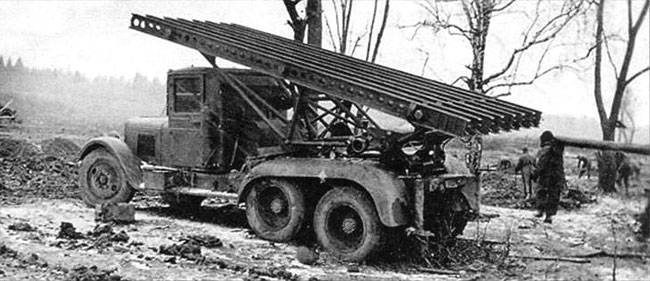 Батарея БМ-13 на шасси автомобиля ЗИС-6 ведёт стрельбу, весна 1942 года