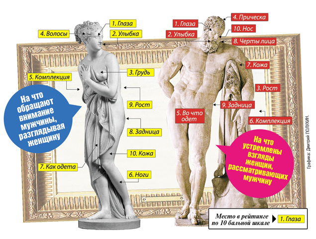 Большинство из нас уверены: мужчина, завидев женщину, в первую очередь смотрит на ее грудь, во вторую — чуть пониже спины. Или — в противоположной последовательности. А женщина, разглядывая мужчину, оценивает, насколько выпуклы его ягодицы, широки плечи. Казалось бы, какие тут могут быть сомнения. Однако они возникли, когда британские ученые обнародовали результаты своего исследования, проведенного недавно. В нем участвовали тысяча мужчин и столько же женщин.