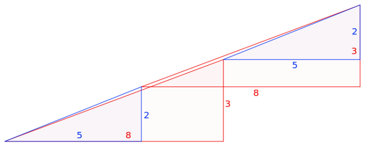Площади закрашенных фигур, разумеется, равны между собой (32 клетки), однако, то, что визуально наблюдается как треугольники 13×5, на самом деле таковым не является, и имеет разные площади (S13×5 = 32,5 клетки). То есть ошибка, замаскированная в условии задачи, состоит в том, что начальная фигура поименована треугольником (на самом деле это — вогнутый 4-угольник). Это отчётливо заметно на рисунках 2 и 3 — «гипотенузы» верхней и нижней фигур проходят через разные точки: (8,3) вверху и (5,2) — внизу. Секрет в свойствах синего и красного треугольников. Это легко проверить вычислениями.