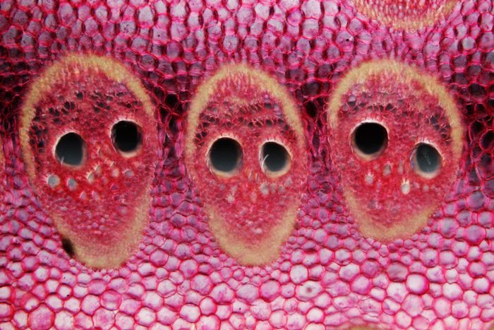 Поперечный срез проводящих пучков кокоса. «Глаза» на фотографии представляют собой сосуды ксилемы, по которым вверх поднимается вода с минеральными веществами.