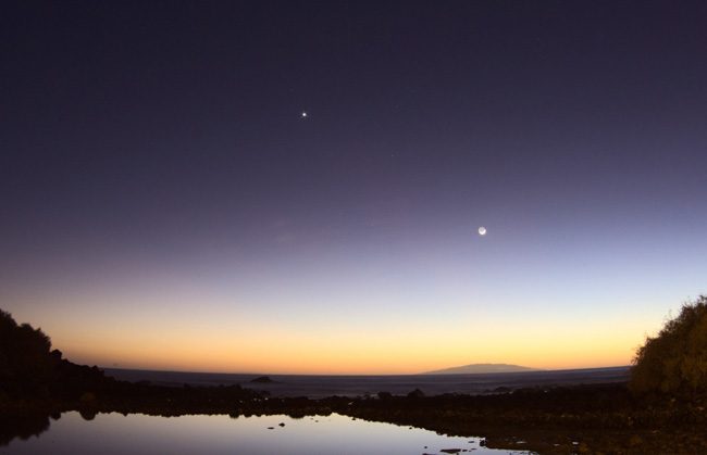Венера и Луна вечером 4 декабря 2013 года в Ла Гомера, Испания.