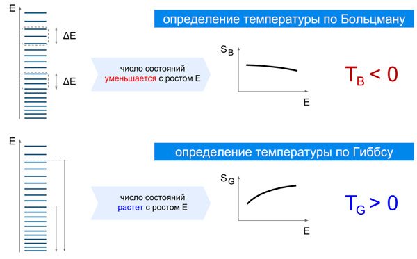 Два определения энтропии — по Больцману и по Гиббсу — могут давать сильно разные результаты для соответствующих температур. Рассмотрим систему, у которой плотность энергетических уровней уменьшается с ростом энергии. Энтропия по Больцману (SB) — это логарифм от количества уровней внутри небольшого интервала ΔE. Энтропия по Гиббсу (SG) — это логарифм от полного числа уровней ниже данной энергии. Для изображенной системы SB уменьшается с ростом энергии, а SG — растет. Поэтому температура по Больцману получается отрицательной, а по Гиббсу — положительной.