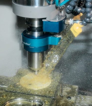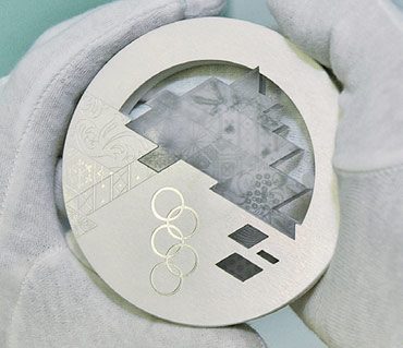 После вытачивания в заготовках просверлили специальные технологические отверстия. На следующих операциях именно они будут посадочными местами для жёсткой ориентации и крепления заготовок на станках. Кстати, уже на этой стадии появляется разница между олимпийскими и паралимпийскими медалями. Посадочные отверстия у них разные и число их разное: в олимпийской медали — четыре, в паралимпийской — восемь. Этому есть два объяснения: художественное — у них разные рисунки и технологическое — их уже невозможно перепутать. Теперь заготовки шлифуют, убирают биения, их поверхность становится совершенно ровной и можно приступать к дальнейшей обработке: фрезерованию надписей, рисунков и фасок в тех местах, где будут прорезаны окна для вставки кристаллов.