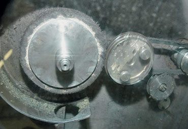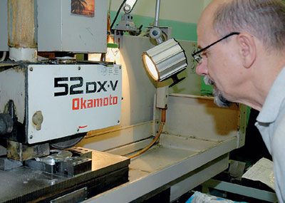 Лицевую и оборотную стороны медали (аверс и реверс) шлифуют на высокоточном станке в направлении, параллельном одной из граней кристалла. У станка — шлифовщик Виталий Андреевич Овсянников.