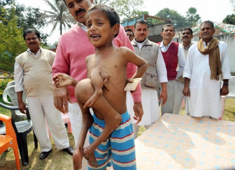 Индийский мальчик с лишними конечностями на груди