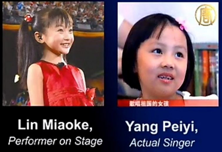 Национальные интересы превыше всего: для выступления на сцене церемонии открытия Олимпийских игр 2008 года маленькую Янг Пей посчитали недостаточно симпатичной, и ее заменила Лин Мяок, которой пришлось старательно открывать рот под звуки песни юной исполнительницы. Музыкальный директор церемонии заявил: «Аудитория нас поймет, так как мы защищали национальные интересы».