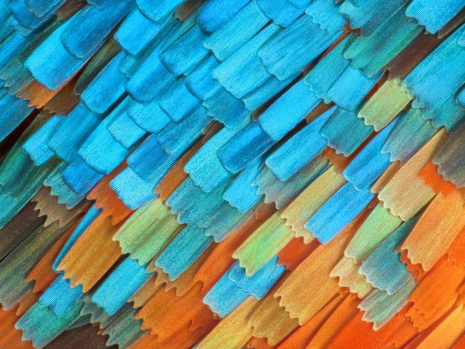 Чешуйки на крыльях бабочки Atlides halesus из семейства голубянок.