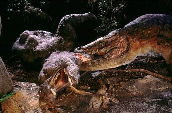 Это крупнейшая из известных науке наземных ящериц. Ящерица достигала длины 7м и была вооружена набором острых зубов. Как и ее живущие родственники, мегалания была ядовитой. Ее ядовитый укус и острые клыки позволяли ей убивать добычу размером с носорога. Но что самое страшное, этот хищник жил в одно время с человеком и, возможно, охотился на него время от времени.