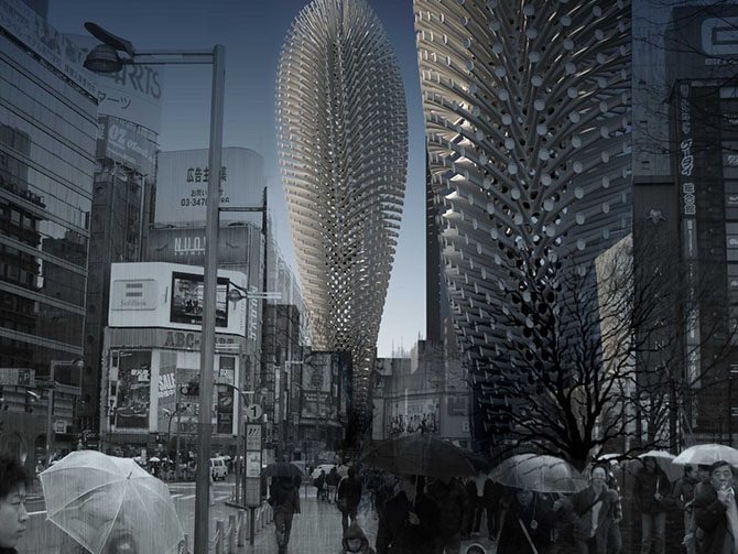 Проект “Бамбуковый лес” предназначен преимущественно для Азии. Автор предлагает обнести здание постоянными бамбуковыми лесами в качестве дополнительного упрочения конструкции на случай землетрясения. Ещё одним преимуществом этого проекта является возможность выращивания вертикальных садов.