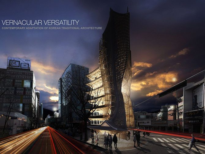 Первый приз получил проект, соединивший черты национальной корейской архитектуры с особенностями современного многоцелевого высотного здания.