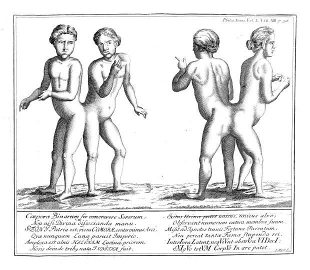 Хелен и Джудит родились в Венгрии в 1701-м году предположительно с интервалом в три часа. Правда это или нет, напуганной и обессиленной родами матери предстало ужасное зрелище: тазы девочек были сросшимися, спина к спине. С двух до девяти лет девочек выставляли напоказ по всей Европе, и в каждой стране их осматривали местные врачи.