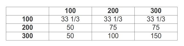 Расшифровать принцип раздела наследства, описанный в Мишне, многие годы никто не мог. На самом деле это закон о банкротстве, и он соответствует современным правилам: имущество разделяется пропорционально между кредиторами. А если взять первую строку, то мы имеем дело со справедливым разделением. Это показывает, что нет единого решения в этой истории из теории игр. Но каково же общее правило? Средняя строчка в таблице на первый взгляд не несет никакого смысла (долг распределяется не на равные части и не на пропорциональные — одна вдова получает 50, остальные по 75) — это уже не экономика, а теория игр.