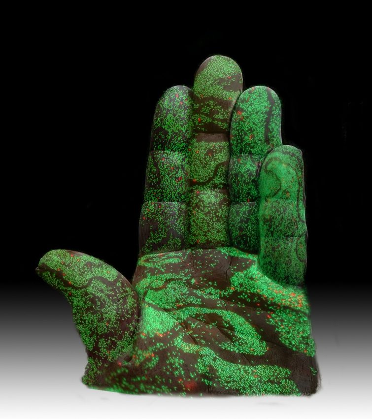 Лидия-Мари Жубер визуализировала бактериальную биоплёнку, покрывающую руку человека с увеличением в 400 раз, за что получила приз зрительских симпатий. Иллюстрация показывает, что микробы сопровождают вас всегда — как бы тщательно вы ни мыли руки.