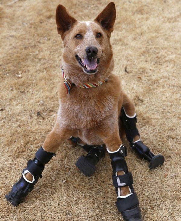 Этот пес Накио потерял все свои конечности в результате обморожения, теперь он бегает на четырех протезах.