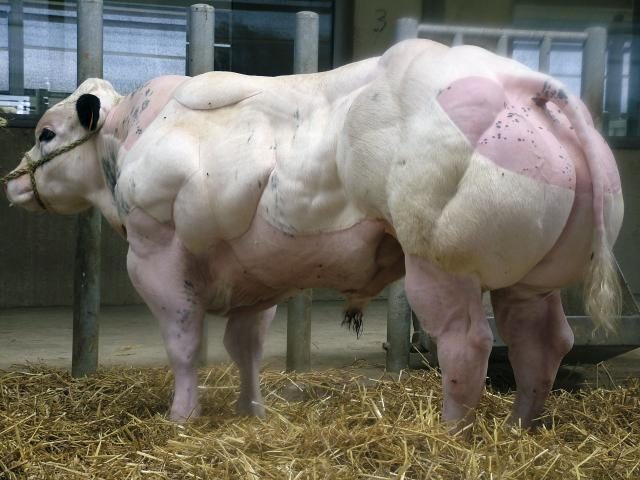 Хотя бельгийская голубая не была создана с помощью генной модификации, можно легко подумать, что дело было именно так. Бельгийская голубая порода была выведена методом селекции особей с дефектным геном миостатина (ген, который отвечает за остановку роста мышц), что привело к появлению коров с двойной мускулатурой. Мясо бельгийских голубых более постное, с пониженным содержанием жира, что приводит к значительно большему риску для здоровья коров (и инбридингу), чем у других пород. Зато цена на стейки из этого мяса самая высокая.