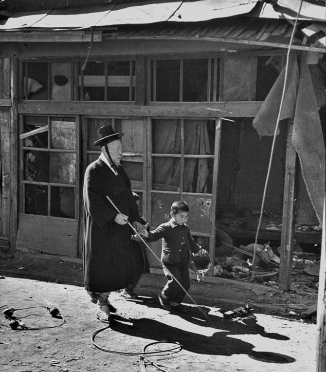 Мальчик ведет слепого старика по разрушенным войной улицам. Корейская война, 1951 год.