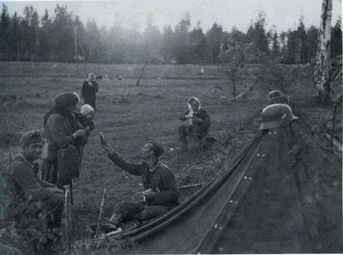 Немецкий солдат делится своим пайком с матерью и ее ребенком. Мясной Бор, Вторая мировая война, 1941 год.