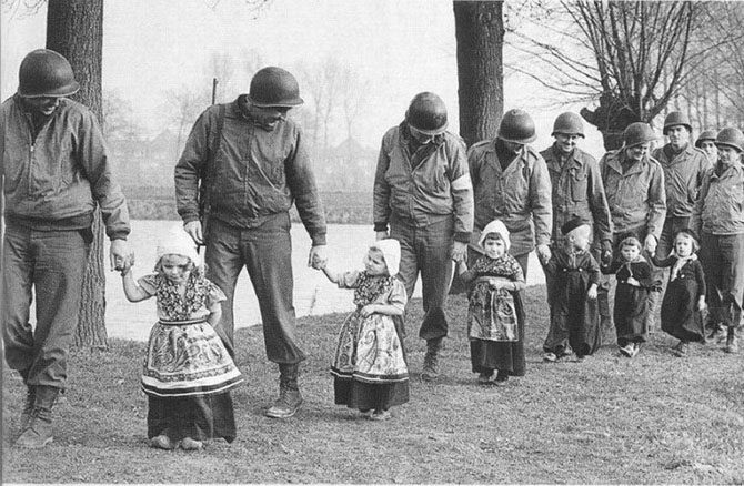 Американские солдаты ведут голландских детей на танцы. Вторая мировая, 1944-1945 гг.
