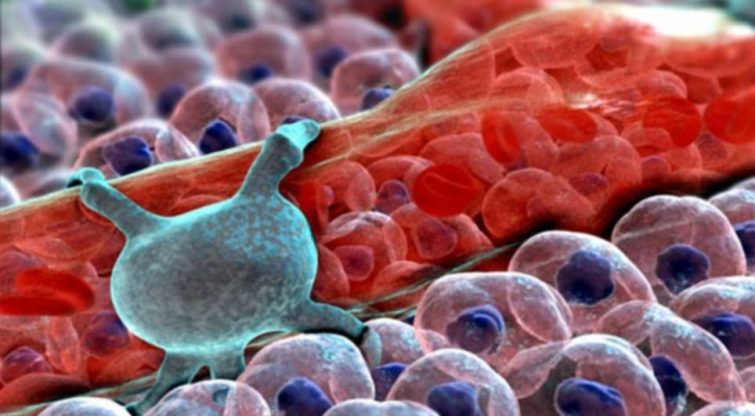 Перициты (зеленые) находятся на капиллярах. Перициты регулируют капиллярный кровоток.
