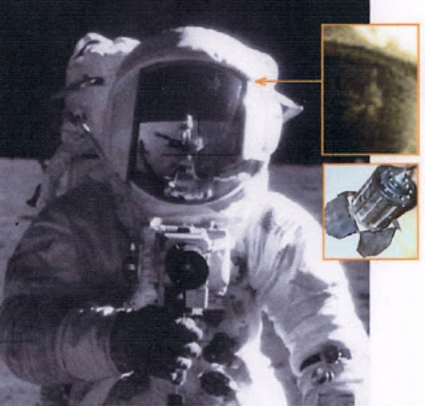 После опубликования фотографий высадки на Луну теоретики сразу же заметили загадочный объект в отражении на шлеме астронавта из миссии «Аполлон 12». Объект выглядел так, как будто он висит на веревке или проволоке. В результате появились предположения о съемках в киностудии. Однако сходство сомнительно, учитывая низкое качество фотографии. Но тайна остаётся тайной, поскольку какой-то объект всё же висит в воздухе (или без воздуха) на Луне. На лунном модуле на других фото нет никаких объектов, которые могли бы отражаться в шлеме, потому это отражение до сих пор остается необъяснимым явлением.