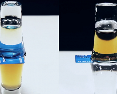 Инструкция: наполните одну рюмку водой, а другую виски. Положите пластиковую карту на рюмку с водой, затем переверните ее и поместите на рюмку с виски так, чтобы карта находилась между рюмками, и немного сместите ее, создав зазор для смешения жидкостей. Через 10 минут виски и вода поменяются местами.