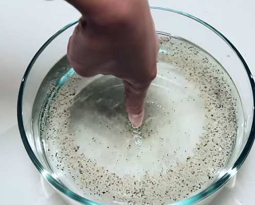 Как это работает: из-за сил поверхностного натяжения перец плавает на поверхности. Мыло препятствует водородной связи между молекулами воды, нарушая поверхностное натяжение. При этом нарушении вода растекается, захватив крупинки перца.