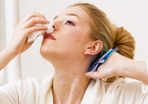 Больного нужно привести в положение полусидя, а затем сдавить нос большим и указательным пальцами на две – три минуты, не наклоняя и не слишком сильно запрокидывая голову. Потом сделайте холодный компресс, приложите лед.