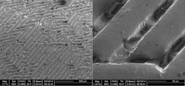 Далее Данн и Эдвардс наносят изображение на металл, используя для этого технику, называемую фотолитографией. Сначала они печатают изображение на прозрачном листе, который затем помещается на светочувствительный материал, покрытый слоем стали. Там, где на листе есть чернила, свет пройти не может. Далее они светят на металл ультрафиолетовой лампой. И на стали возникает гравюра. Затем на поверхность наносится золото.