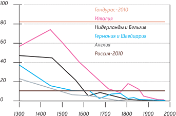 Современные данные по Гондурасу — стране с наихудшим показателем в мире (82 на 100 тыс. человек) — и России (13) приведены для сравнения.