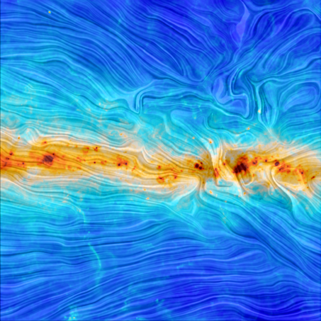 Цвета на этом уникальном снимке показывают температуру (от наиболее горячего темно-красного до ледяного темно-синего). Из рельефных линий ученые делают выводы о форме огромного магнитного поля, окутывающего нашу галактику.