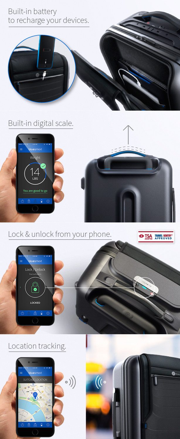 Умный чемодан с весами, встроенными устройствами для подзарядки мобильных устройств и отслеживания месторасположения