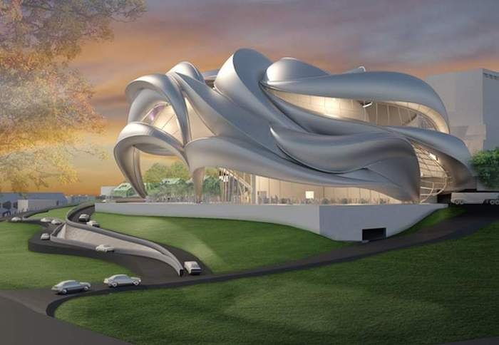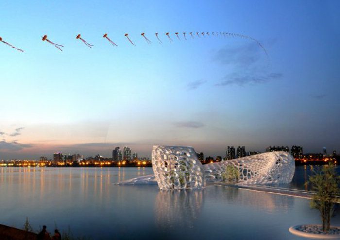 Футуристическая конструкция танцующего на волнах здания центра искусств в Сеуле позволяет ему отражать водную поверхность, тем самым как бы повторяя линии течения и волн реки.