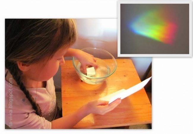Опыт: В емкость наливаем воду и кладем на дно зеркало. Направляем на зеркало свет фонарика. Отраженный свет нужно поймать на бумагу, на которой должна появиться радуга.