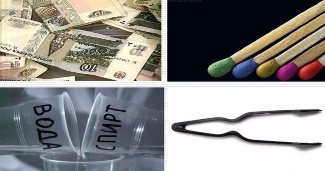 Опыт: В спиртовой раствор добавить щепотку соли, погрузить купюру в раствор, чтобы она полностью пропиталась. Достать щипцами купюру из раствора и дать стечь лишней жидкости. Поджечь купюру и наблюдать, как она горит, не сгорая.