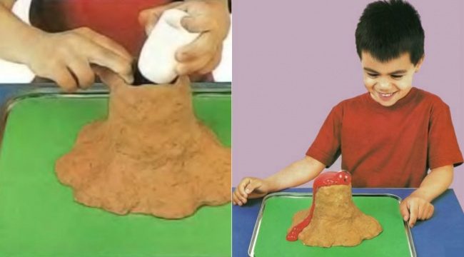 Опыт: Вокруг небольшой пластиковой бутылочки из глины или песка следует слепить небольшой вулкан — для антуража. Чтобы вызвать извержение, следует в бутылочку засыпать две столовые ложки соды, влить четверть стакана теплой воды, добавить немного пищевого красителя, а в конце влить четверть стакана уксуса.