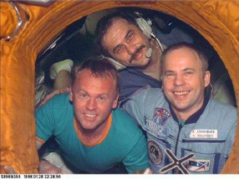 Космонавты А. Соловьев и П. Виноградов чинят в открытом космосе орбитальную станцию «Мир».
