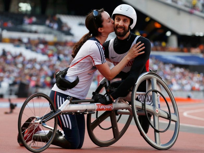 А вот это личное достижение. Канадец принимает поздравление от жены, после того как выиграл 100-метровку среди спортсменов на колясках на Паралимпийских играх 2012 в Лондоне.