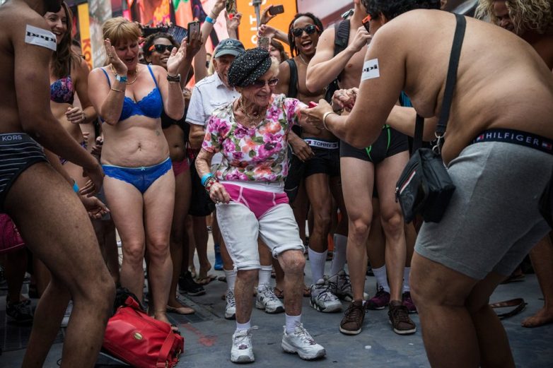 Таймс-сквер, Нью-Йорк, 5 августа. Попытка установить новый рекорд по наибольшему количеству людей, собранных в нижнем белье в одном месте. Организаторы надеялись, что примут участие 2 271 человек, поскольку предыдущий рекорд был 2 270. Во флешмобе приняла участие пожилая пара из Флориды. Правда, только в плане танцев.
