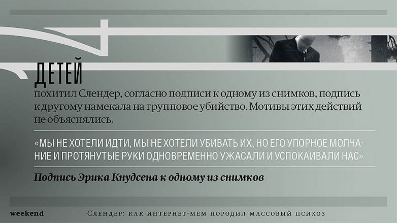 Это талантливый фотошоп: монстр стоит вдали, надо присмотреться, чтобы его найти. Большую тревогу вызывают и сами дети, и обрывочные, ничего толком не объясняющие подписи. Может быть, поэтому, а может быть, случайно, но Слендер сразу превратился в героя коллективного творчества. Сначала на Something Awful, потом и на других форумах стали появляться истории, картинки, коллажи. Легенда будто бы обретала контуры, но оставалась столь же туманной: долговязый незнакомец без лица, в похоронном костюме, с очень длинными руками, живет в пригородном лесу, похищает детей и подростков. Кто он? Что он делает со своими жертвами? Зачем? Неизвестно. Но если много думать о Слендере, он придет за тобой. Возможно, он уже здесь, когда ты читаешь это.