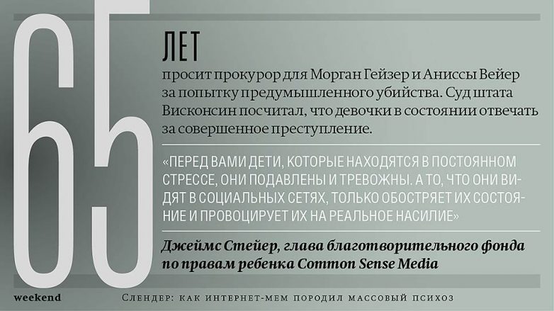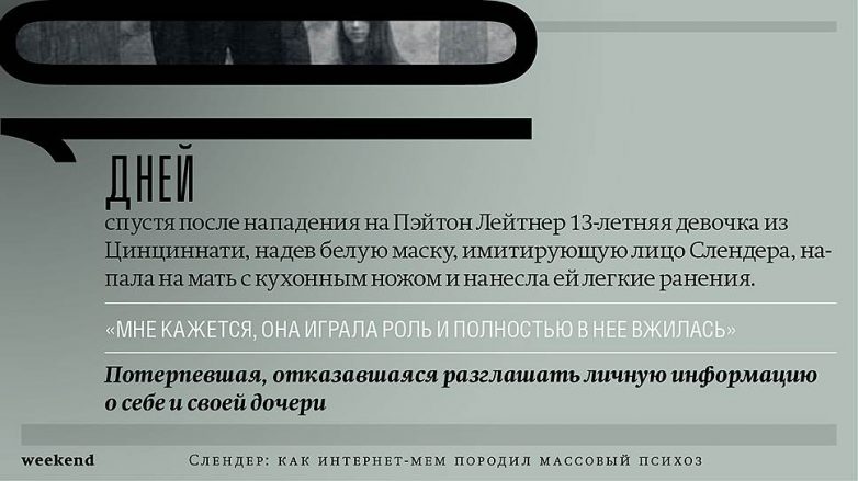Но рядом с этой историей происходит другая. Поп-культурный взлет Слендера не остановил распространение мифа. Прошлой весной две двенадцатилетние девочки из пригорода Милуоки пригласили подружку погулять в лес и девятнадцать раз ударили ее ножом. Та выжила чудом. Как выяснилось, подруги прочитали в интернете подробную инструкцию о том, как принести жертву Слендеру, стать его фаворитками. И решили попробовать. Девочек сейчас судят, им грозит до 65 лет тюрьмы. Другая вдохновленная Тонким человеком девочка напала с ножом на свою мать, еще одна подожгла дом с семьей. Пока обошлось без жертв. Но с этими эпизодами Слендер окончательно стал фактом «внешней» социальной реальности. История, имитирующая массовые психозы, запустила психоз настоящий.