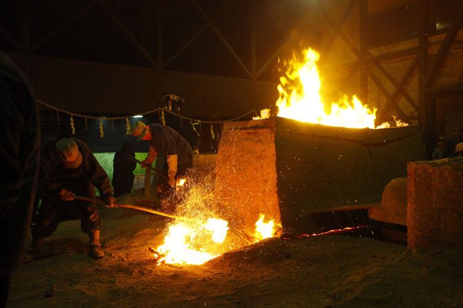 В наши дни железная руда извлекается магнитом, а вот в Древней Японии чтобы отделить песок сооружались водные каналы в волнистыми препятствиями на дне. Более тяжёлый железный песок скапливался за этими препятствиями, в то время как вода уносила более лёгкий песок. Полученный чёрный железный песок был довольно чистым и переплавлялся в специальной плавильной печи татаре с большим количеством древесного угля. Конечным продуктом являлась высокоуглеродистая сталь, которая называется «тамахаганэ».