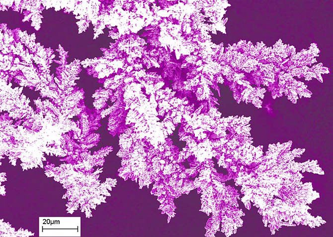 В ходе этих экспериментов металлу позволили выйти за пределы пластиковой формы. Получив возможности «расти» свободно, металл стал образовывать причудливые структуры, напоминающие кораллы и цветы.