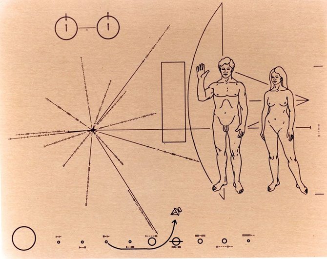 В начале 1970-х годов NASA запустило два беспилотных космических корабля — «Пионер-10» и «Пионер-11» — с целью изучения соответственно Юпитера и Сатурна. Помимо сложной технической «начинки» на бортах кораблей были прикреплены необычные пластинки из анодированного алюминия. Зачем? По мнению известных астрономов Карла Сагана и Фрэнка Дрейка, они помогли бы инопланетянам понять, откуда и зачем прибыли «Пионеры». На пластинках, прикреплённых к корпусу корабля, были схематически изображены мужчина, женщина, Солнечная система с указанием расстояния от главного светила до Земли и атомы водорода.