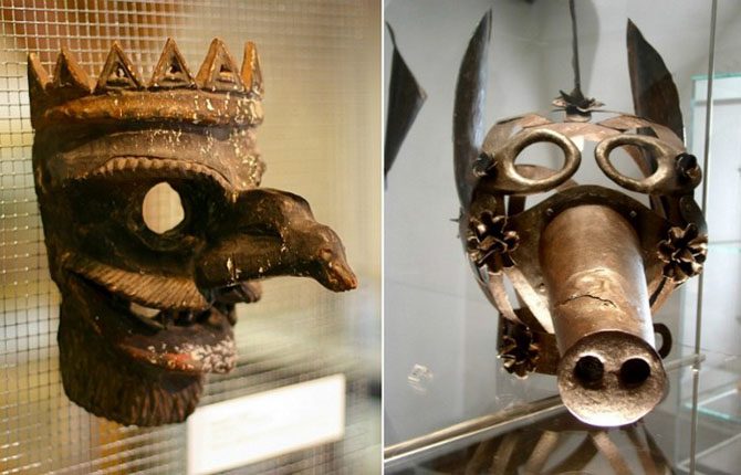 Надевали такие маски и на мужчин и даже на детей. Так, мужчин, которых уличили в пьянстве, заставляли носить маску свиньи.