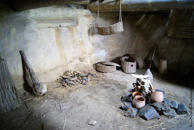 Основу жилища составляла вырытая в земле круглая яма метра полтора глубиной – так было жить теплее. В ее стенах могли располагаться ниши-полочки для разных вещей – первобытная мебель.