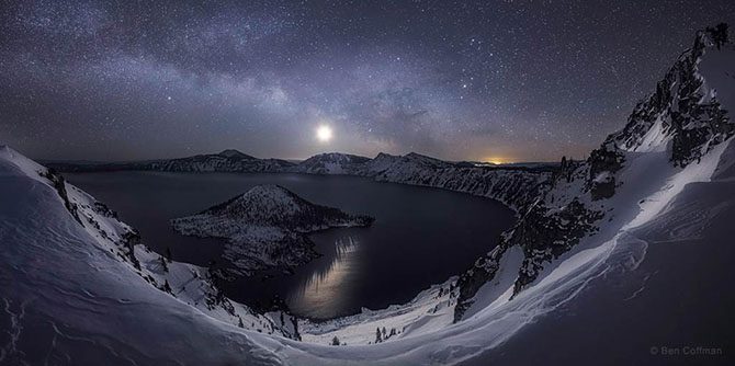 Третье место в категории «Красота ночного неба» занял Бен Коффман. Снимок «Взъерошенные перья» был сделан в феврале 2015 года и показывает Млечный Путь и Луну над Кратерным озером в штате Орегон, в США.