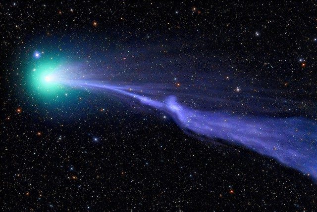C/2014 Q2 — это уже пятая комета, открытая австралийским астрономом-любителем Терри Лавджоем. В конце 2014-го и начале 2015 года ее можно было увидеть в бинокль (или даже невооруженным глазом) в небе Земли. Сине-зеленый цвет кометы связан с двухатомным газом, сгорающим по мере ее перемещения. Ее хвост фрагментирован под влиянием солнечного ветра.