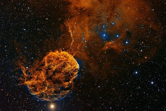IC443, или туманность Медузы в созвездии Близнецов — это остаток сверхновой, взорвавшейся сравнительно недавно: от 30 до 3000 лет назад.