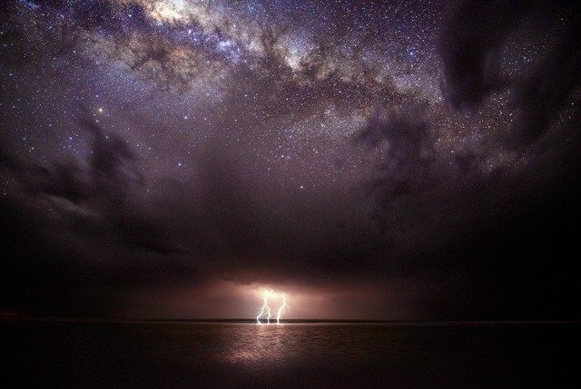 Редкое зрелище природного светового шоу: буря над морем и сверкающие звезды Млечного Пути. Снимок сделан у озера Эйр в южной Австралии. Фотографу пришлось использовать градиентный фильтр (и перевернуть его вверх ногами), чтобы сбалансировать выдержку на разных участках снимка, — так ему удалось подчеркнуть красоту нашей галактики.