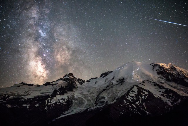 Убежав от черного медведя, американский фотограф забрался на вершину горы и сделал этот снимок. На небе видны звезды Млечного пути и яркий след метеора. Белые огни на склоне горы (стратовулкана Рейнир, штат Вашингтон) — это фонарики альпинистов.